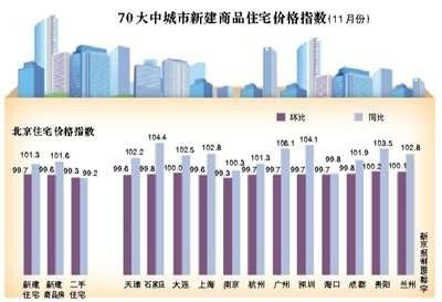 11月份70个大中城市新建住宅环比价格下降城市首次过半,达49个;持平的城市有16个;上涨的城市仅有5个。统计显示,涨幅最大的是贵阳,也仅是0.2%。
