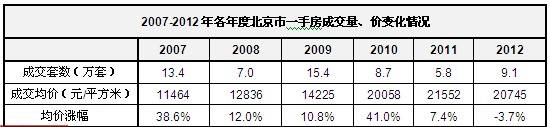 数据显示,2012年全市新房成交均价为20745元/平方米,同比去年下降3.7%,是自有统计记录以来,北京全市年度交易均价均首次出现回落。