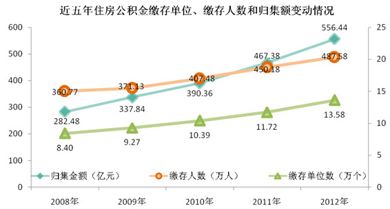 ——住房公积金归集。2012年共归集住房公积金和补充公积金556.44亿元,同比增长19.06%。其中,住房公积金427.94亿元,占77%;补充公积金128.50亿元,占23%。截至2012年底,累计归集住房公积金和补充公积金3548亿元。