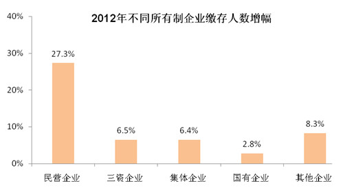 进一步分析发现,在2012年缴存企业中,民营企业缴存人数增幅最高,达到27.3%,其次是三资企业、集体企业和国有企业,增幅分别为6.5%、6.4%、2.8%。2012年不同所有制企业缴存人数增幅见下图: