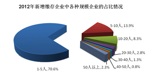 在2012年新增的缴存企业中,中小企业占比日趋上升。其中,1-5人的企业占比70.6%、1-10人的占比84.5%,均同比上升约2个百分点。而50人以上的企业仅占新增缴存企业的2.3%。2012年新增缴存企业中各种规模企业的占比情况见下图: