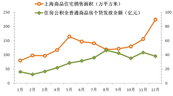 2012年本市商品住宅销售面积与住房公积金普通商品房个贷发放情况见下图: