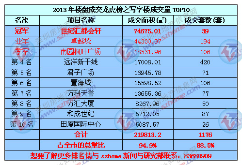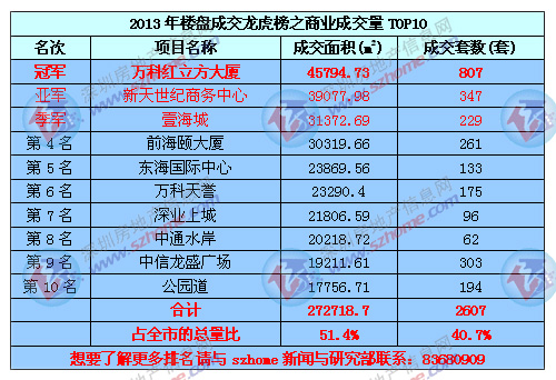 2013年深圳商业共成交530243.8平方米,成交面积环比2012年增1.14倍。细观2013年商业楼盘成交看到,前十甲全为商务公寓,不限购不限贷的商务公寓当之无愧成为2013年商业成交明星产品。