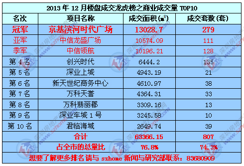 2013年12月深圳市商业共成交82509.55平方米/1086套,成交面积环比11月大增1.12倍,套数环增1.37倍。京基滨河时代广场商务公寓面市以来备受市场喜爱,凭借良好的地段和产品品质,成交279套,成交面积13028.7平方米,摘取全市商业成交龙虎榜桂冠。