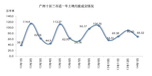 2014年1月广州全市共成交土地11宗,总面积68.52万平米(包括从化、增城二市),环比下降24%;住宅用地成交4宗,分别位于荔湾、海珠、黄埔和番禺,共占地面积9.05万平米,占总面积的13.2%。