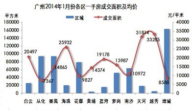 2014年1月,广州十区二市商品房批售面积86.1万平米,环比下降60%,同比下降30%,供应较上月有所下降;其中主力供应区域集中在番禺和番禺。 2.2 成交分析