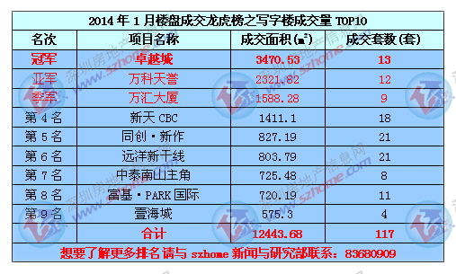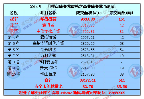 深圳一手商业成交去年表现良好,2013年商业成交面积环比2012年增1.14倍,商务公寓成为成交主力,深圳楼市在长期的限购政策下,一部分资金充裕因为限制无法购买住宅的购房者,往往会转向商务公寓,2014年1月一手商业成交中,除万科翡丽郡成交商铺外,其余9个均为商务公寓项目。