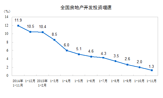 2015年1-11月份,全国房地产开发投资87702亿元,同比名义增长1.3%,增速比1-10月份回落0.7个百分点。其中,住宅投资59069亿元,增长0.7%,增速回落0.6个百分点。住宅投资占房地产开发投资的比重为67.4%。