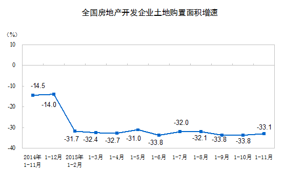 1-11月份,房地产开发企业土地购置面积19894万平方米,同比下降33.1%,降幅比1-10月份收窄0.7个百分点;土地成交价款6409亿元,下降26.0%,降幅扩大0.8个百分点。