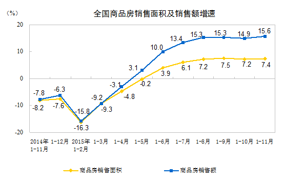 1-11月份,商品房销售面积109253万平方米,同比增长7.4%,增速比1-10月份提高0.2个百分点。其中,住宅销售面积增长7.9%,办公楼销售面积增长16.2%,商业营业用房销售面积增长2.7%。商品房销售额74522亿元,增长15.6%,增速提高0.7个百分点。其中,住宅销售额增长18.0%,办公楼销售额增长26.9%,商业营业用房销售额增长0.3%。