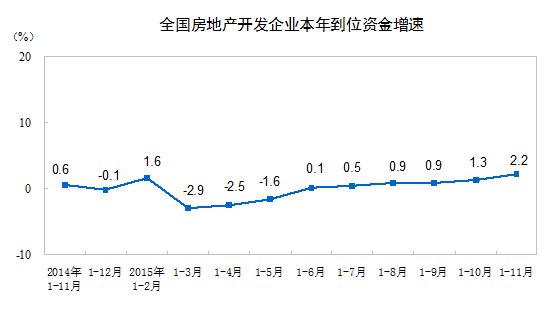 1-11月份,房地产开发企业到位资金112563亿元,同比增长2.2%,增速比1-10月份提高0.9个百分点。其中,国内贷款18628亿元,下降3.2%;利用外资258亿元,下降51.4%;自筹资金44648亿元,下降3.4%;其他资金49029亿元,增长11.2%。在其他资金中,定金及预收款28538亿元,增长6.4%;个人按揭贷款14714亿元,增长21.3%。
