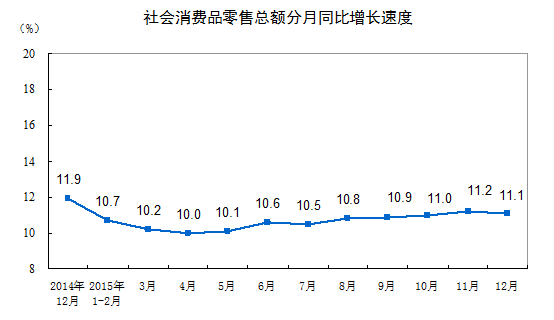 按经营单位所在地分,12月份,城镇消费品零售额24566亿元,同比增长10.9%;乡村消费品零售额4069亿元,增长12.0%。2015年全年,城镇消费品零售额258999亿元,比上年增长10.5%;乡村消费品零售额41932亿元,增长11.8%。