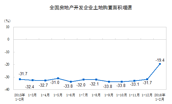 1-2月份,房地产开发企业土地购置面积2236万平方米,同比下降19.4%,降幅比去年全年收窄12.3个百分点;土地成交价款705亿元,增长0.9%,去年全年为下降23.9%。