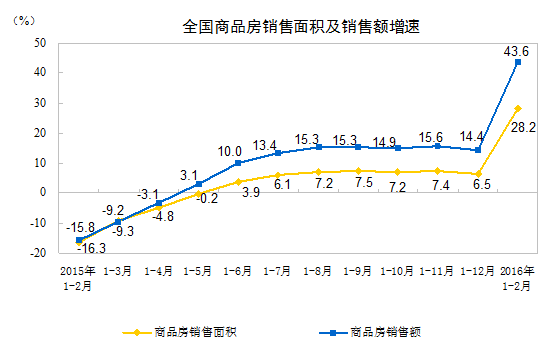 1-2月份,商品房销售面积11235万平方米,同比增长28.2%,增速比去年全年提高21.7个百分点。其中,住宅销售面积增长30.4%,办公楼销售面积增长11.0%,商业营业用房销售面积增长9.4%。商品房销售额8577亿元,增长43.6%,增速提高29.2个百分点。其中,住宅销售额增长49.2%,办公楼销售额增长29.7%,商业营业用房销售额增长7.8%。