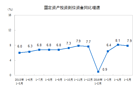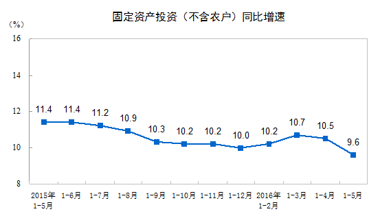 2016年1-5月份,全国固定资产投资(不含农户)187671亿元,同比名义增长9.6%,增速比1-4月份回落0.9个百分点。从环比速度看,5月份固定资产投资(不含农户)增长0.49%。