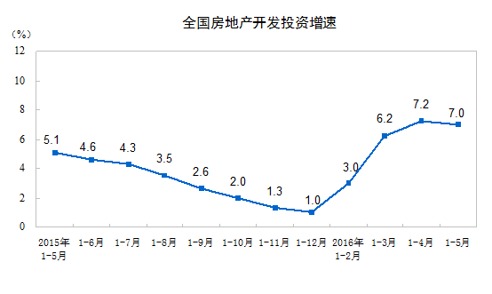 2016年1-5月份,全国房地产开发投资34564亿元,同比名义增长7.0%,增速比1-4月份回落0.2个百分点。其中,住宅投资23118亿元,增长6.8%,增速提高0.4个百分点。住宅投资占房地产开发投资的比重为66.9%。