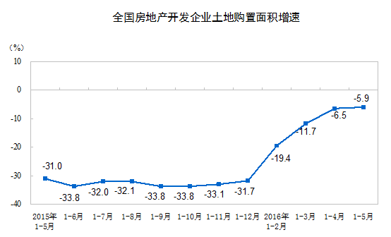 1-5月份,房地产开发企业土地购置面积7196万平方米,同比下降5.9%,降幅比1-4月份收窄0.6个百分点;土地成交价款2295亿元,增长4.7%,1-4月份为下降0.2%。