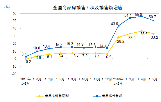 1-5月份,商品房销售面积47954万平方米,同比增长33.2%,增速比1-4月份回落3.3个百分点。其中,住宅销售面积增长34.2%,办公楼销售面积增长44.0%,商业营业用房销售面积增长18.1%。商品房销售额36775亿元,增长50.7%,增速回落5.2个百分点。其中,住宅销售额增长53.4%,办公楼销售额增长72.8%,商业营业用房销售额增长21.2%。