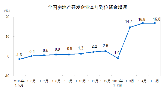 1-5月份,房地产开发企业到位资金53681亿元,同比增长16.8%,增速与1-4月份持平。其中,国内贷款8945亿元,增长2.3%;利用外资42亿元,下降72.1%;自筹资金18643亿元,增长1.4%;其他资金26051亿元,增长39.4%。在其他资金中,定金及预收款14840亿元,增长35.2%;个人按揭贷款8838亿元,增长58.5%。