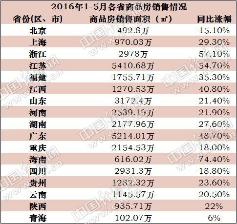 近日,浙江、江苏、广东、北京、上海等全国17个省(区、市)相继公布了今年1-5月商品房开发投资和销售情况。据记者统计,已公开数据的省份基本保持着较高速度的销售增长,其中6个省份前5月商品房销售面积增幅超过全国整体水平,海南省增幅达74.4%,为全国最高。
