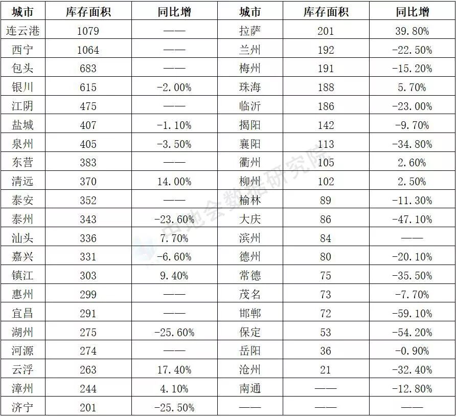 注:此处统计数据主要是待售面积。 数据来源:中地会数据研究院