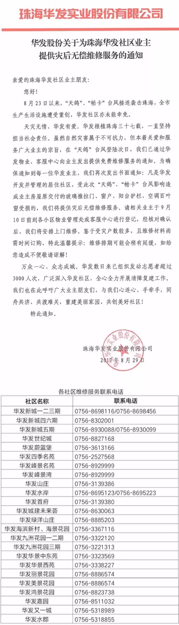 台风“天鸽”与“帕卡”虽已离去,但珠海救灾修复工作仍在进行之中。华发作为珠海的龙头国企,始终与城市风雨同舟,相携与共。 台风无情,华发有爱!当此关头,本着关爱并服务广大业主的宗旨,华发再次向广大华发社区业主通知,旗下开发并管理的居住社区,因双台风影响造成房屋交付的玻璃推拉门、窗户、阳台护栏、空调百叶窗受损的情况,将提供灾后无偿维修服务! 如果您恰好也是华发社区业主,那么请仔细阅读以下通知,在规定时间内进行登记!