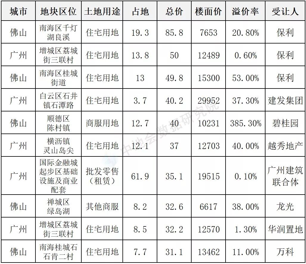 1-7月,广东大湾区城市10宗地成交价逾30亿元,最高85.8亿元;17宗地溢价率超100%。其中,成交总价最高的10宗地,皆来自于广佛地区。