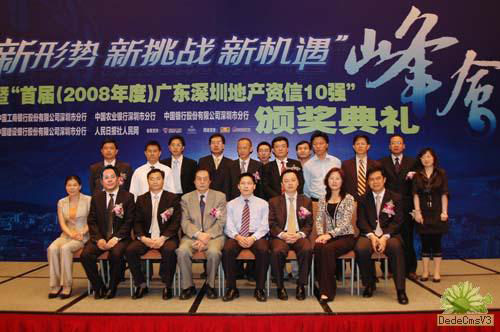 4月15日下午,“新形势·新挑战·新机遇”广东地产金融峰会暨“首届(2008年度)广东深圳地产资信10强”颁奖典礼在深圳大梅沙京基喜来登度假酒店成功落下帷幕。工、农、中、建四大国有商业银行有关负责人及人民日报社人民网总裁何加正出席了会议。参加会议的还有获选10家企业的有关负责人。